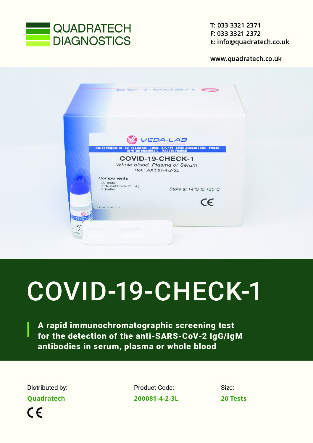 VedaLab COVID-19-CHECK-1 IgG/IgM Antibody Cassette (CE Marked 10min Whole Blood/Serum/Plasma) x 20 Test Kit