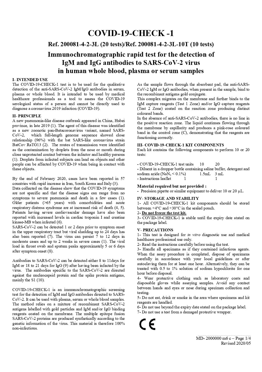 COVID-19-CHECK-1 IgG/IgM Cassette (CE Marked 10min Whole Blood/Serum/Plasma) 20 Test Kit for Medical Healthcare Professional Use Only (200081-4-2-3L) is a rapid test for the qualitative detection of antibodies (IgG and IgM) to SARS-CoV-2 in whole blood, serum, or plasma. For medical healthcare professional in vitro diagnostic use only.