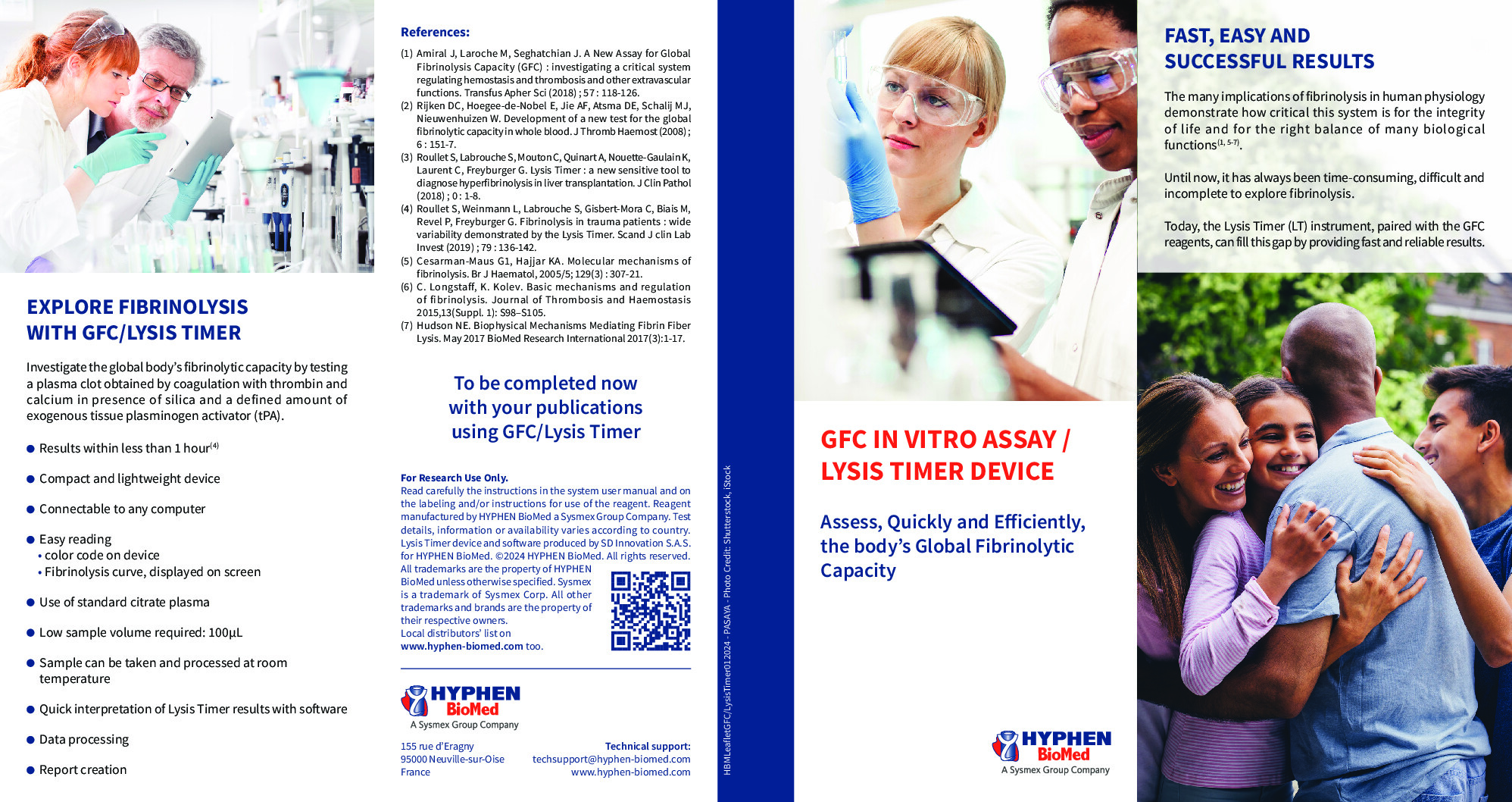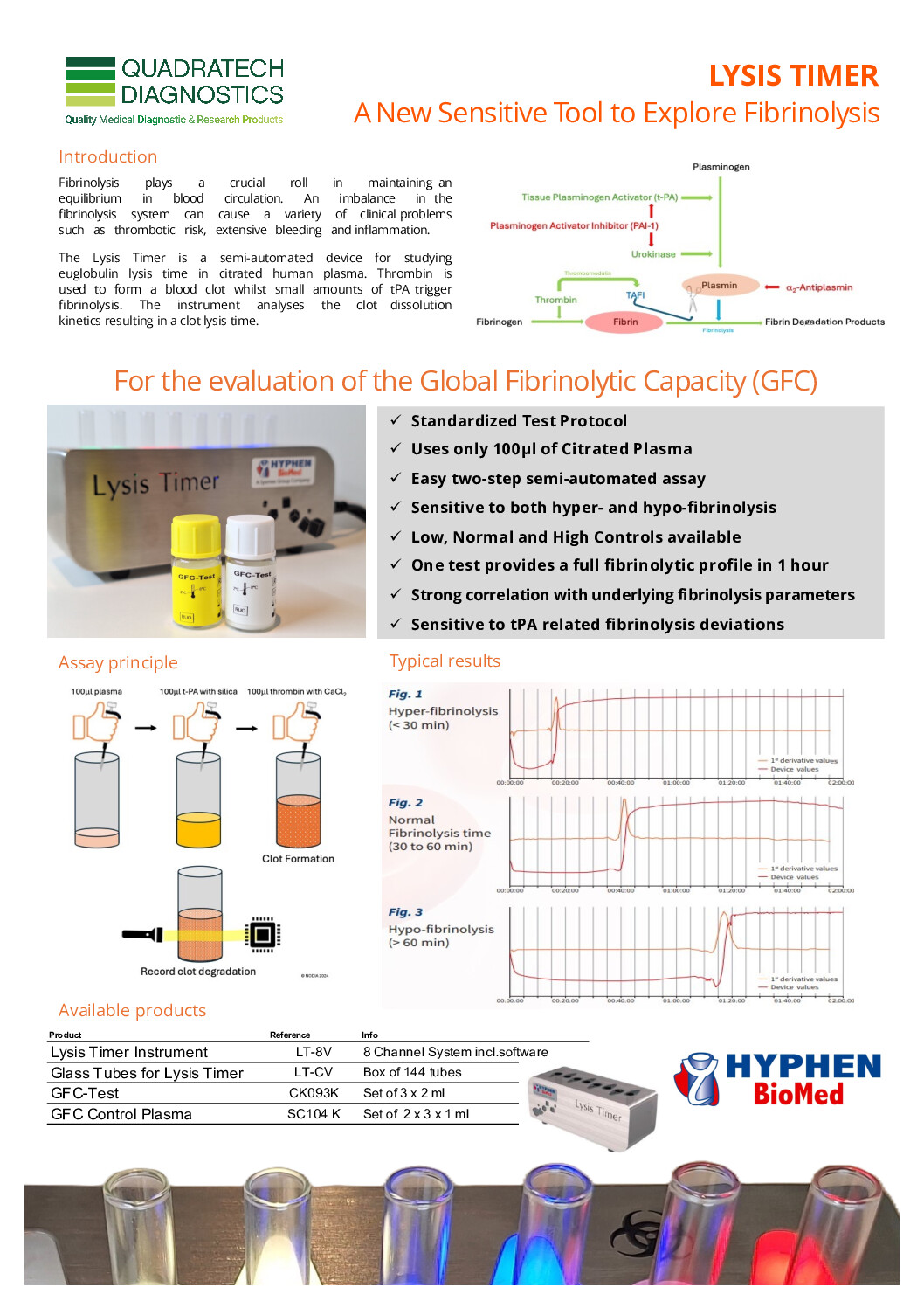 For us with The Lysis Timer (LT) which is a handheld device, recently optimized by HYPHEN BioMed to evaluate the body’s global fibrinolytic capacity (GFC) in citrated plasma. The GFC/LT method has the advantage to provide results in less than 1 hour and provides better performances than viscoelastic tests.
