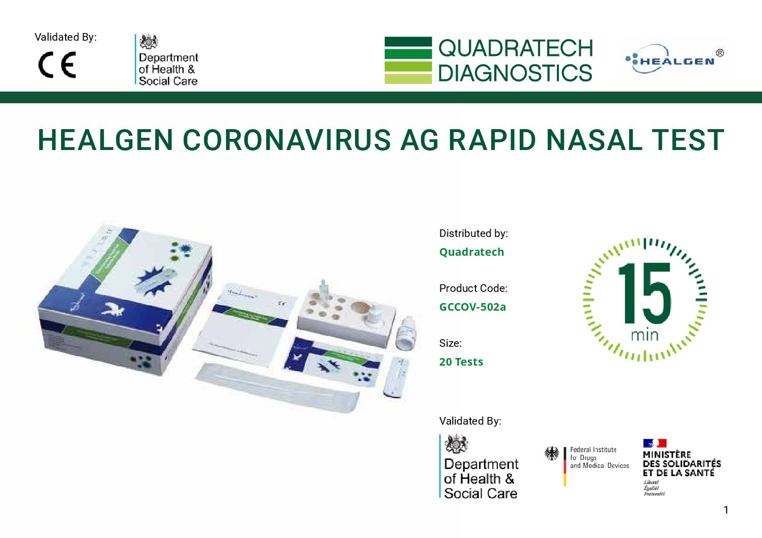 COVID-19 Rapid Antigen Test (CE Marked 15min Nasopharyngeal or Nasal Swab) 20 Test Kit (GCCOV-502a) is a rapid in vitro immunochromatographic lateral flow test assay for the qualitative detection of SARS-CoV-2 nucleocapsid protein antigen. Manufactured by Healgen for medical healthcare professional in vitro diagnostic use only.