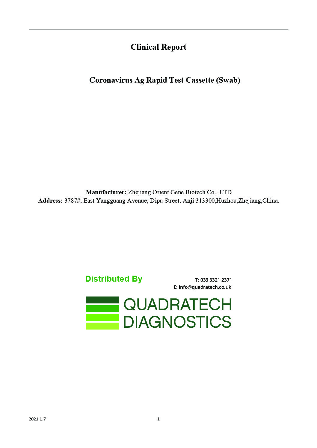The novel coronaviruses belong to the β genus. COVID-19 is an acute respiratory infectious disease. People are generally susceptible. Currently, the patients infected by the novel coronavirus are the main source of infection; asymptomatic infected people can also be an infectious source. Based on the current epidemiological investigation, the incubation period is 1 to 14 days, mostly 3 to 7 days. The main manifestations include fever, fatigue, and dry cough. Nasal congestion, runny nose, sore throat, myalgia, and diarrhea are found in a few cases. This test is for the detection of SARS-CoV-2 nucleocapsid protein antigen. Antigen is generally detectable in upper respiratory specimens during the acute phase of infection. Rapid diagnosis of SARS-CoV-2 infection will help healthcare professionals to treat patients and control the disease more efficiently and effectively.
