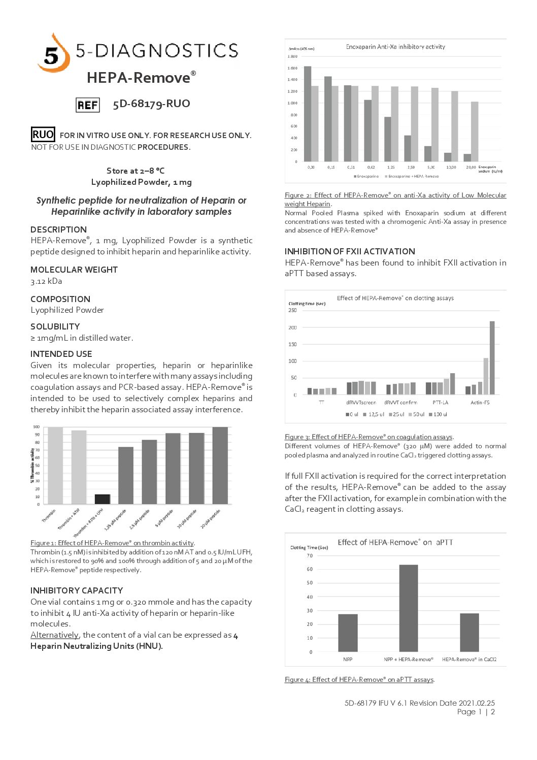HEPA-Remove® (5D-68179) is a synthetic peptide designed to inhibit heparin and heparinlike activity. Given its molecular properties, heparin or heparinlike molecules are known to interfere with many assays including coagulation assays and PCR-based assays. HEPA-Remove® is intended to be used to selectively complex heparins and thereby inhibit the heparin-associated assay interference. Manufactured by 5-Diagnostics.