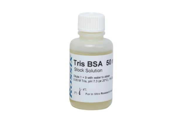 Rox Tris-10% BSA 50 mL (TB035-50) is a diluent buffer, stock solution, for sensitive proteins such as coagulation factors. Diluted buffer fulfils the Ph Eur requirements on a coagulation Factor VIII diluent. Manufactured by Rossix AB.